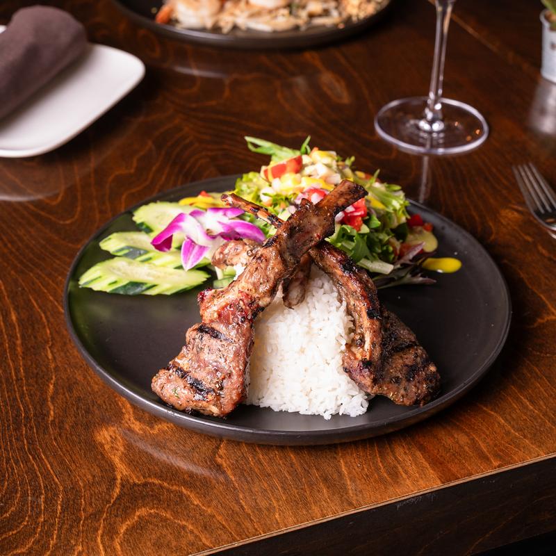 Crispy Australian rack of lamb marinated with soy sauce, pepper, and Thai herbs, served with mixed green salad and jasmine rice.
